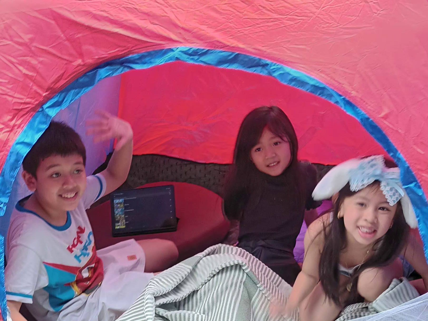 The kids set up camp. My brother placed a tent in one corner of our meeting place, so it became their headquarters. Inside, they secretly ate candies their parents warned them about, opened their tablets, and played Minecraft, zipping the tent closed so no adult could say, “Stop the tablet!”