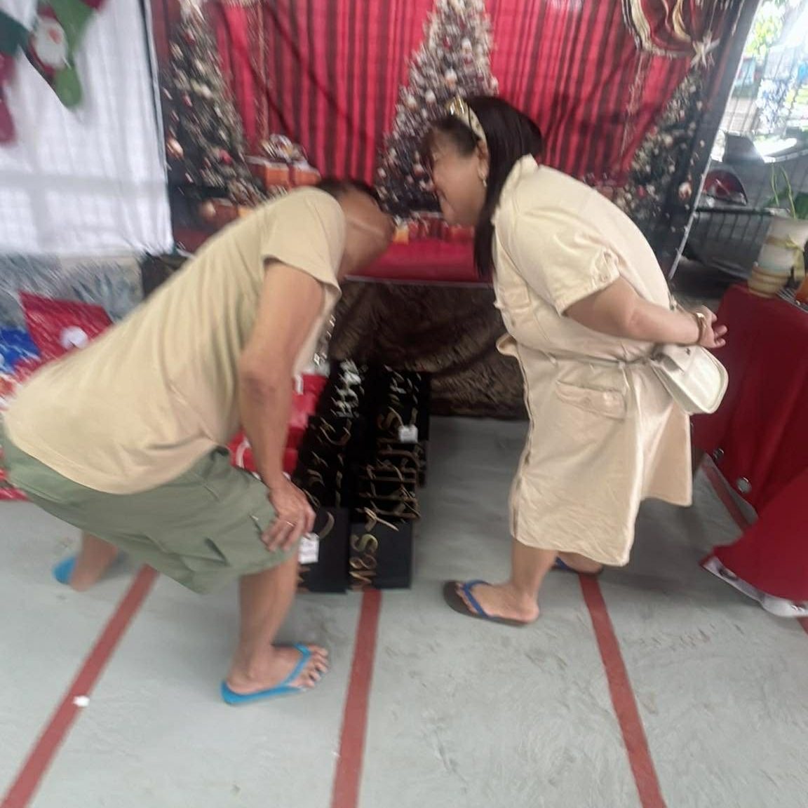 Meanwhile, my sister dons her event planner/organizer persona, decorating our venue. My sister-in-law assists her (though the place is hers), supplying all demanded party plus-plus: tables, a Christmassy background for picture taking, Santa Claus socks hung on a flimsy but cute décor. She even bought new chair pillows.